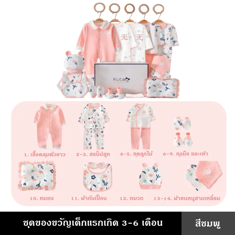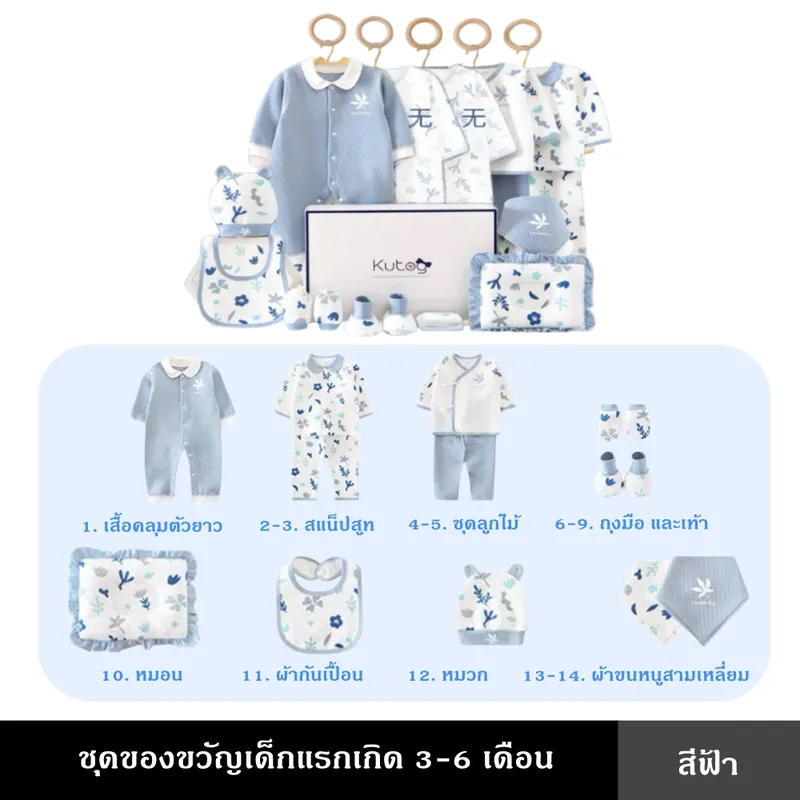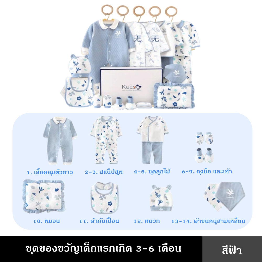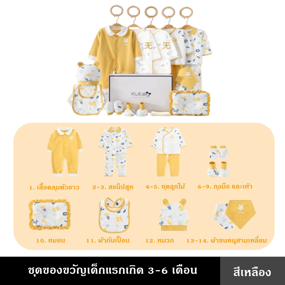 - ชุดของขวัญเด็กแรกเกิด 3-6 เดือน มี 3 สี สีเหลือง สีฟ้า สีชมพู กล่องของขวัญเด็กทารกแรกเกิด ชุดเสื้อผ้า กล่องของขวัญ Baby gift set มี 14 ชิ้น ชุดของขวัญสำหรับเด็กอ่อน เนื้อผ้านุ่มไม่ระคายผิว ผ้าฝ้ายแท้อ่อนนุ่ม คุณภาพดี มีความประณีต ไม่มีสารเรืองแสง ปลอดภัยและเพื่อสุขภาพที่ดี
