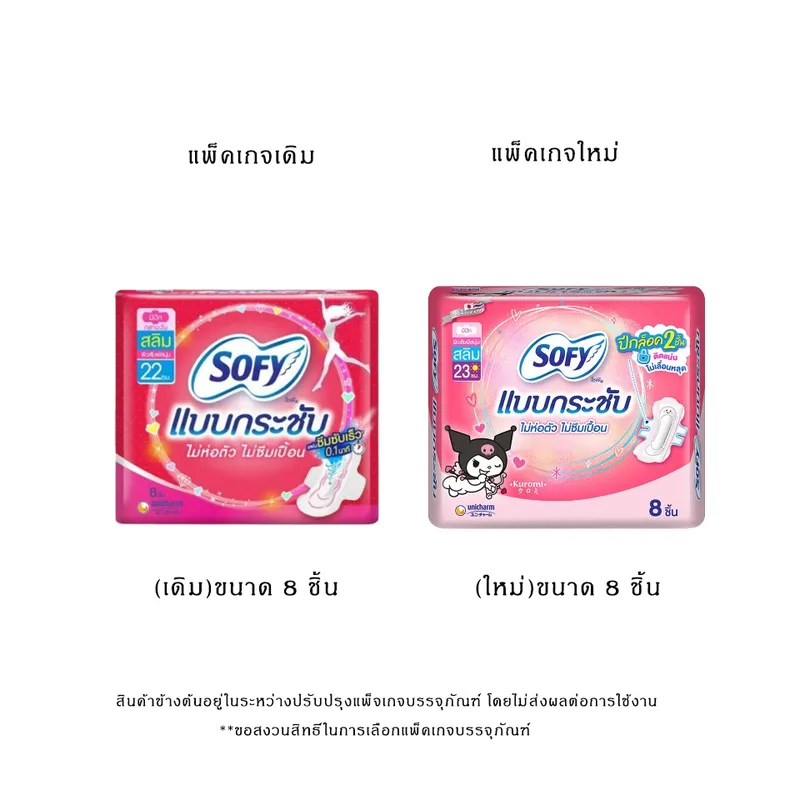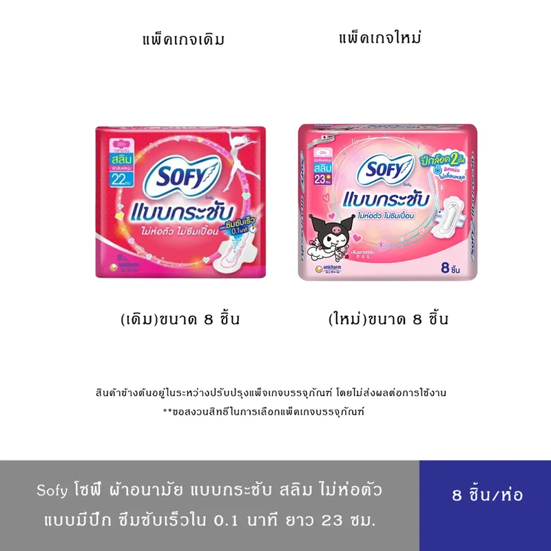 โซฟี แบบกระชับ สลิม ไม่มีปีก 23 ซม.ผ้าอนามัยแบบบาง ไม่ห่อตัว ไม่ซึมเปื้อน ที่แผ่นซึมซับสามารถซึมซับได้เร็วถึง 0.1 นาที จึงทำให้กระชับ คืนรูปได้ดีเยี่ยม ซึมซับเร็ว เคลื่อนไหวอย่างไร ก็ไม่กังวลเรื่องซึมเปื้อน มั่นใจทุกการเคลื่อนไหว สนุกได้ทุกกิจกรรม