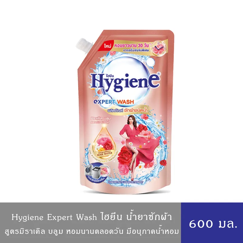 Hygiene Expert ไฮยีน เอ็กเพิร์ทวอช น้ำยาซักผ้า ชนิดน้ำ กลิ่นมิราเคิลบลูม 600 มล. ผลิตภัณฑ์ซักผ้าสูตรเข้มข้นชนิดน้ำ ขจัดคราบหนักฝังลึกและกลิ่นอับติดแน่นได้อย่างหมดจดมาพร้อมกลิ่นหอมสดชื่น ด้วยเทคโนโลยี ไลฟ์ เซ้นท์™ และ ครั้งแรกของ Rose Water ที่ช่วยบำรุงใยผ้า พร้อมบอกลาคราบฝังลึก การันตีขจัดทุกกลิ่นอับหมดจด หอมยาวนาน ด้วยพรีเมียม โรส วอเตอร์ครั้งแรกของการผสาน 2 เทคโนโลยีในการดูแลผ้า ที่สุดของพลังหอมยาวนานจากเซรั่มหอมเข้มข้นสกัดจากดอกไม้มีชีวิตด้วยเทคโนโลยี Life Scent® ไลฟ์ เซ้นท์ สกัดกลิ่นหอมเข้มข้นบริสุทธิ์ 100% มีเฉพาะไฮยีนผสาน Premium Rose Water จากหุบเขาชื่อดังในยุโรป บำรุงลึกขั้นสุดถึงใยผ้า เปรียบเสมือนมอยเจอร์ไรเซอร์ในการบำรุงผ้า ประสบการณ์ใหม่ของการดูแลผ้าอย่างล้ำลึก พร้อมพลังความหอมเข้มข้นตลอดการสวมใส่กลิ่นมิราเคิล บลูม ความหอมหวานพรีเมี่ยม เปล่งประกายระยิบระยับของดอกพีชจากญี่ปุ่น ความสดใสซาบซ่าของเหล่าเบอร์รี่ป่าและส้ม ผสานความหอมละมุนเลอค่าของดอกการ์ดิเนีย พร้อมสัมผัสกลิ่นไอของฤดูใบไม้ผลิอันสดใส มอบประสบการณ์ความหอมพิเศษเสมือนอยู่ท่ามกลางทุ่งดอกไม้ ให้คุณรู้สึกหอมสดชื่นยาวนานตลอดการสวมใส่