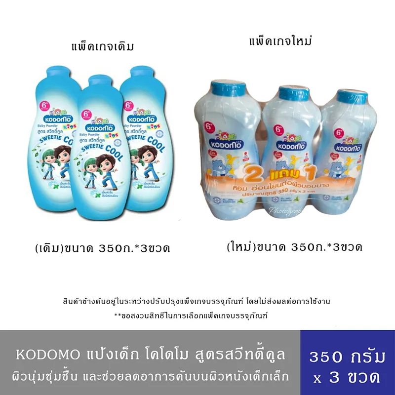 “KODOMO แป้งเด็ก โคโดโม สูตรสวีทตี้คูล Sweetie Cool 350 กรัม (สีน้ำเงิน) แพ็คคู่2+1 ขวด แป้งเด็กโคโดโม สูตรสวีทตี้คูล มีส่วนผสมของเมนทอล ให้ความเย็นสดชื่นอย่างอ่อนโยน และมีส่วนผสมของอโลเวรา (ว่านหางจระเข้) ช่วยให้ผิวนุ่มชุ่มชื่น และช่วยลดอาการคันบนผิวหนังพร้อมผ่านการทดสอบทาง การแพทย์ ว่าอ่อนโยน ไม่ระคายเคือง จากสถาบัน Skinnova Lab เนื้อแป้งผ่านการ Sterilization อีกขั้นของความปลอดภัย มั่นใจ -ให้เด็กคลายร้อน สบายตัว ทำกิจกรรมได้เต็มที่ทั้งวันและปลอดภัยสำหรับทุกคนในครอบครัว ด้วยแป้งที่เข้าใจพัฒนาการของเด็กอย่างลึกซึ้ง เลขจดแจ้ง 20-1-6300023977”