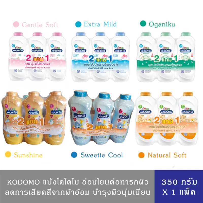 KODOMO แป้งเด็ก โคโดโม สูตรเนเชอรัล ซอพท์ โพรเทคชั่น 350 กรัม แพ็ค2+1 ขวด -แป้งเด็กโคโดโม สูตรเนเชอรัล ซอพท์ โพรเทคชั่น (สีส้ม) -มีส่วนผสมของสารสกัดจากธรรมชาติ ได้แก่ผิวส้ม และ ตะไคร้หอม ซึ่งมีคุณสมบัติในการช่วยไล่ยุงและแมลงรบกวน -น้ำมันสกัดจากตะไคร้หอม มีลักษณะของกลิ่นบำบัดซึ่งช่วยในเรื่องระบบทางเดินหายใจ -น้ำมันสกัดจาก ผิวส้มมีส่วนผสมของวิตามิน A,B และ C ช่วยในการบำรุงผิว มีกลิ่นหอมสดชื่น มีส่วนผสมของ Allantoin
