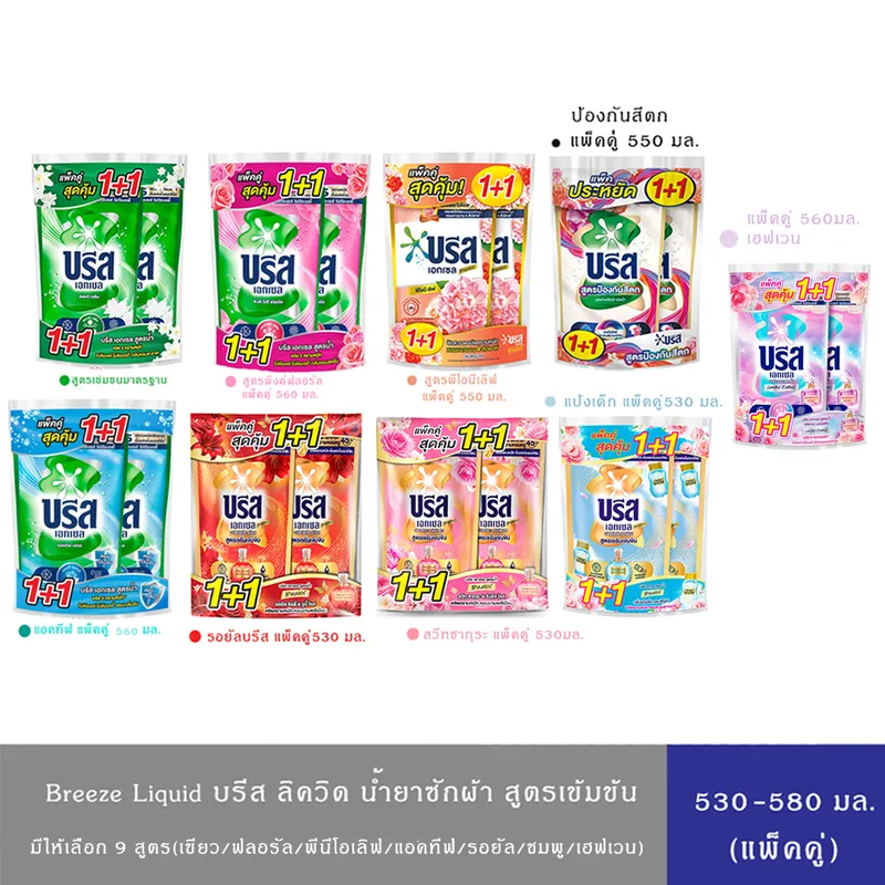 (มี 9 สูตร)Breeze Excel Liquid บรีส เอกเซล ผลิตภัณฑ์น้ำยาซักผ้า สูตรเข้มข้น ขนาด 530-580มล. (แพ็คคู่1+1)1)