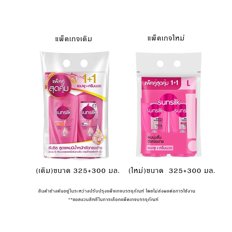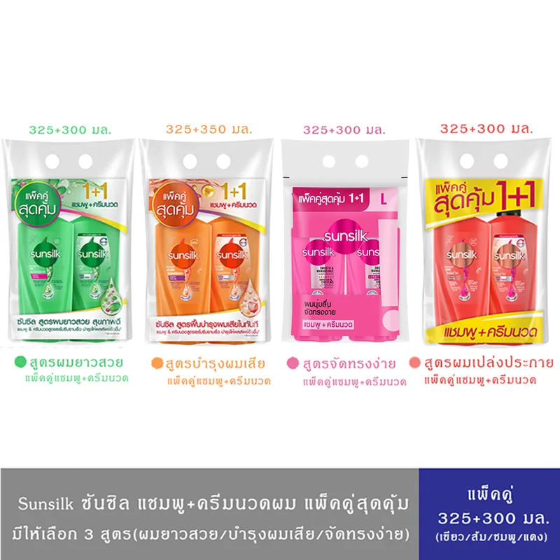 Sunsilk ซันซิล ผลิตภัณฑ์แชมพูยาสระผม+ครีมนวด(สีชมพู,ส้ม,เขียว,แดง) แพ็คคู่ 325+300 มล.