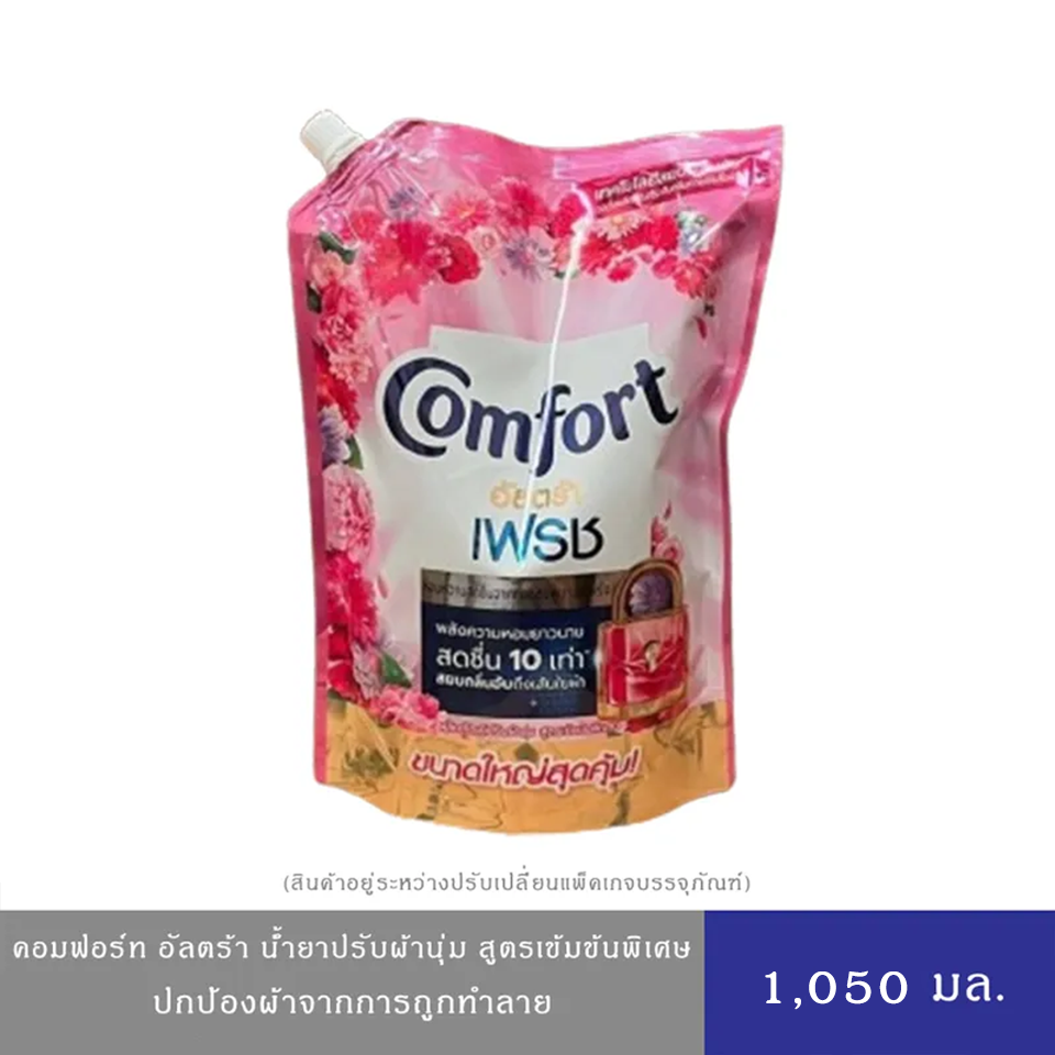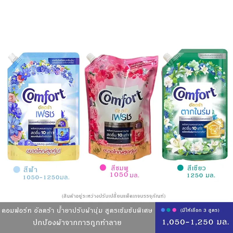 -(สินค้าอยู่ระหว่างปรับเปลี่ยนแพ็คเกจบรรจุภัณฑ์)Comfort คอมฟอร์ท อัลตร้า ผลิตภัณฑ์ปรับผ้านุ่ม สูตรเข้มข้น หอมยาวนาน สูตรสีฟ้า,ชมพู,เขียว ถุงเติม 1,050-1,250 มล.ีฟ้า,ชมพู,เขียว ถุงเติม 1,250 มล.