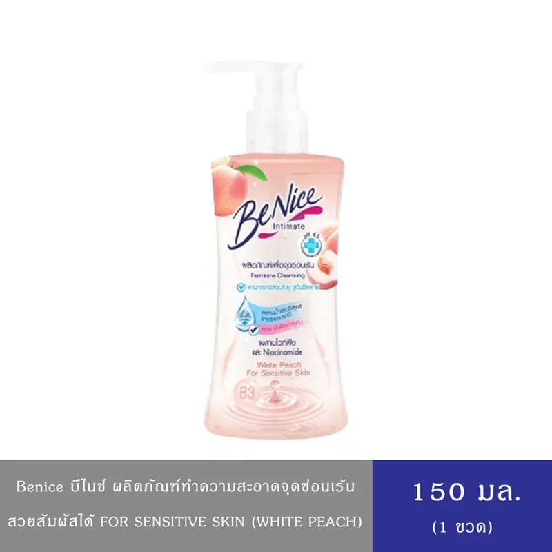 Pure natural mineral water and natural extracts such as Lavender, Rosemary, Sage and Thyme which have antioxidant properties, help reduces odor and irritation, leaving a long-lasting feeling of freshness, softness and comfort. Suit for sensitive skins which maintain your natural pH balance gently, but effectively cleansing. This product is hypoallergenic. **BeNice Feminine Cleansing White Peach For Sensitive Skin 150ml บีไนซ์ดูแลจุดซ่อนเร้น ไวท์ พีช เพื่อผิวบอบบาง ให้คุณสัมผัสผิวชุ่มชื้น กระจ่างใส พร้อมกลิ่นหอมละมุนของพีช