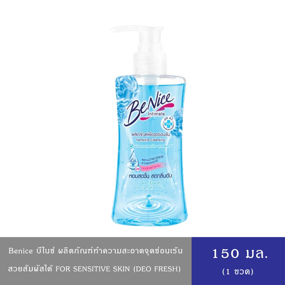 **BeNice Feminine Deo Fresh 150ml ผลิตภัณฑ์เพื่อจุดซ่อนเร้น สดชื่น เพื่อผิวบอบบาง สูตรใส ปกป้องยาวนาน คงความสดชื่นอย่างอ่อนโยน ให้กลิ่นหอมสดชื่น ด้วยสารสกัดจาก Passion Flower ผสานน้ำแร่บริสุทธ์จากสวิตเซอร์แลนด์ ไม่ทำให้เกิดอาการแพ้และระคายเคือง