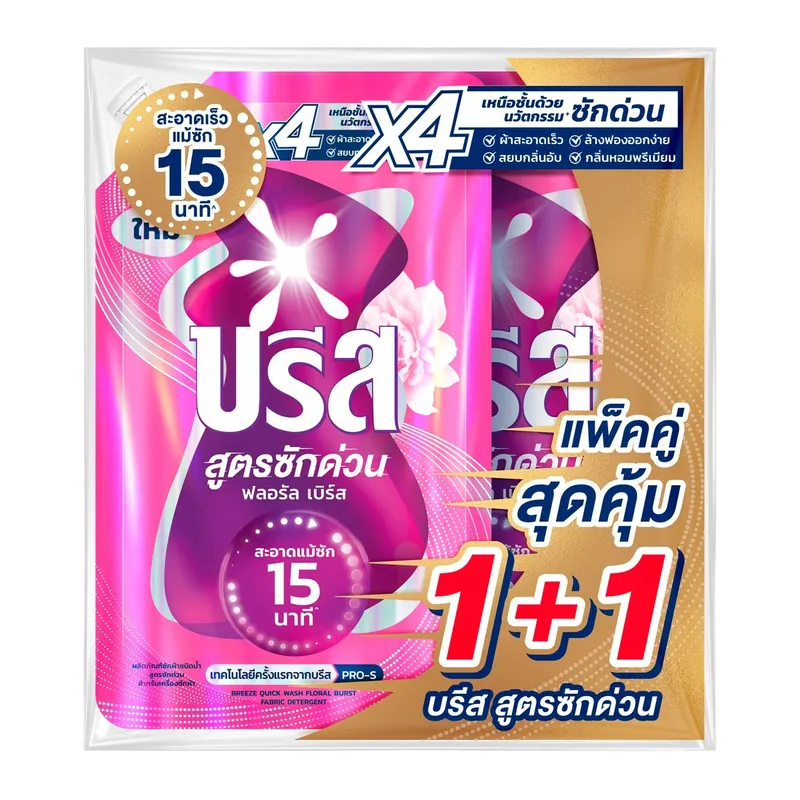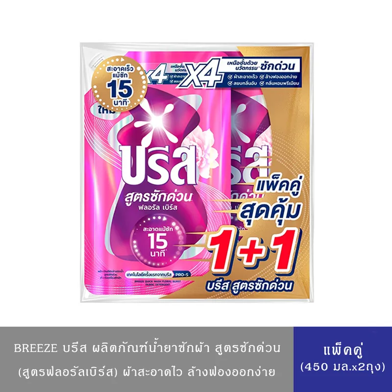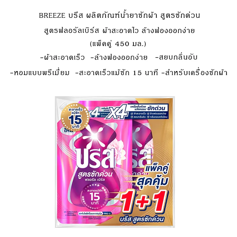 1.บรีส น้ำยาซักผ้าสูตรซักด่วน ฟลอรัล เบิร์ส สำหรับเครื่องซักผ้า 450 มล. แพ็ค 1+1