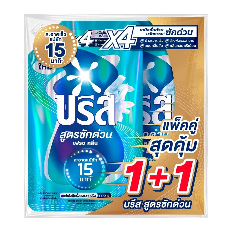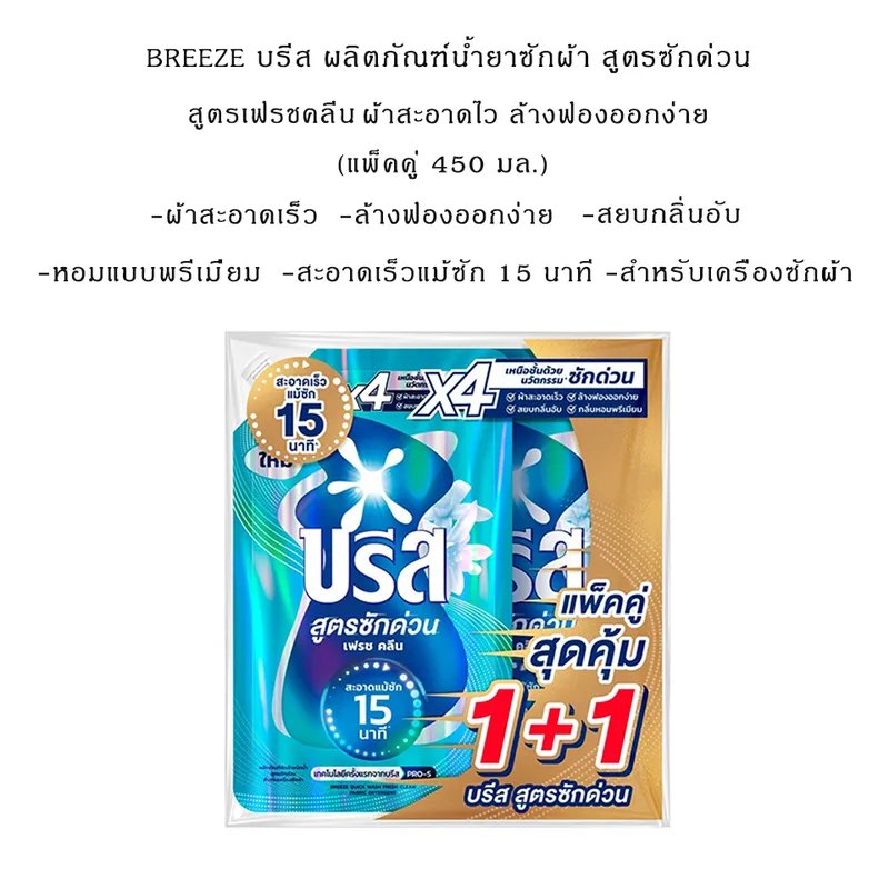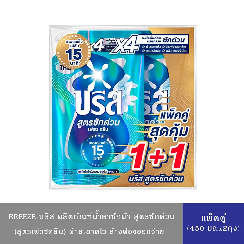 2.บรีส น้ำยาซักผ้าสูตรซักด่วน เฟรช คลีน สำหรับเครื่องซักผ้า 450 มล. แพ็ค 1+1