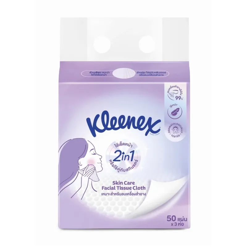 กระดาษเช็ดหน้าเนื้อผ้า KLEENEX (คลีเน็กซ์) Skin Care เนื้อสัมผัสกระดาษสองแบบ 2in1 ใช้เช็ดหน้าหรือใช้คู่กับสกินแคร์ทำความสะอาดผิวหน้า ลบเครื่องสำอางได้สะอาดถึง 99%เมื่อใช้คู่กับคลีนเซอร์ ให้สัมผัสนุ่มกว่า^ ขุยน้อย~ อ่อนโยนต่อผิวผ่านการทดสอบจากผู้เชี่ยวชาญด้านผิวพรรณ ผลิตจากเส้นใยธรรมชาติ100% ไม่มีส่วนผสมของสารเรืองแสง เพื่อให้การดูแลผิวของคุณสะดวกและประหยัดมากขึ้น