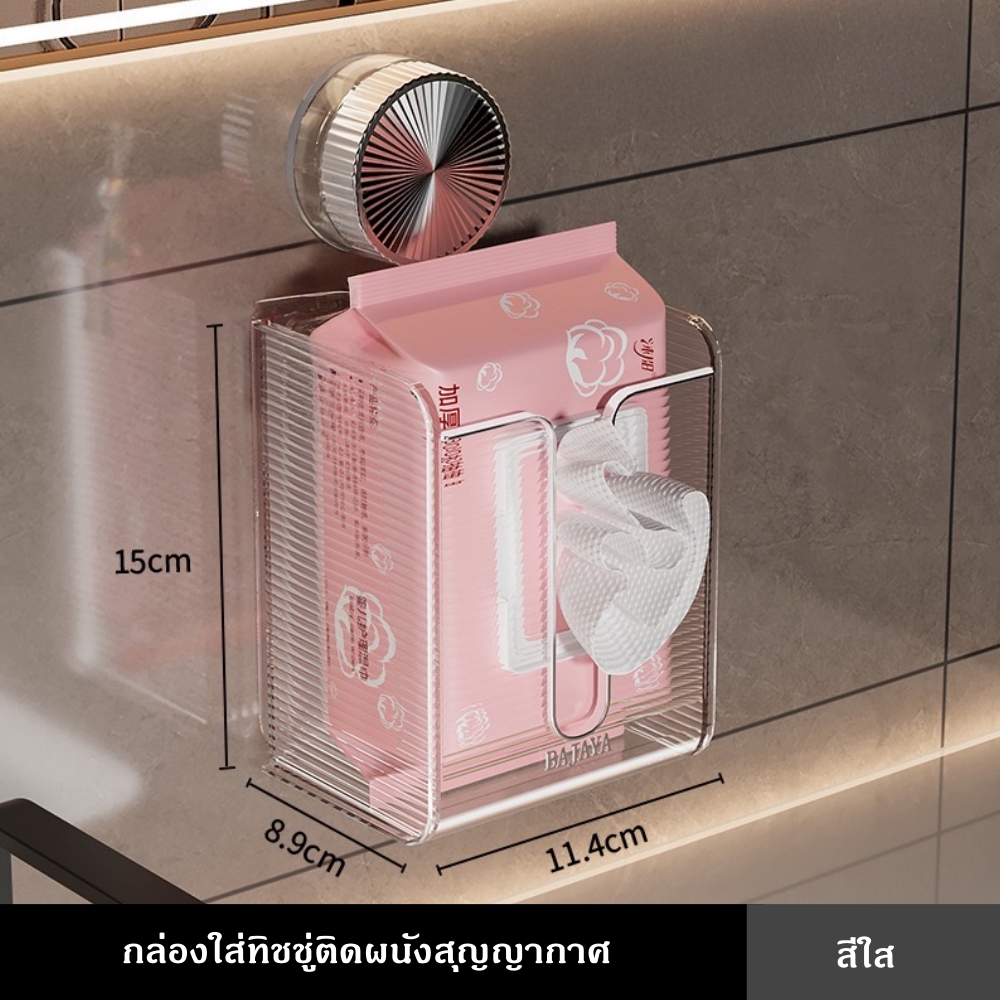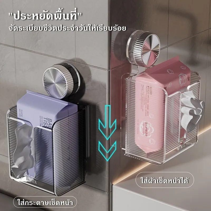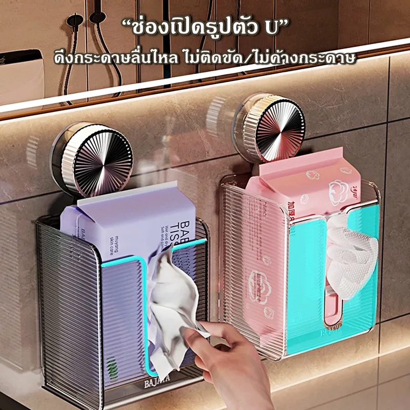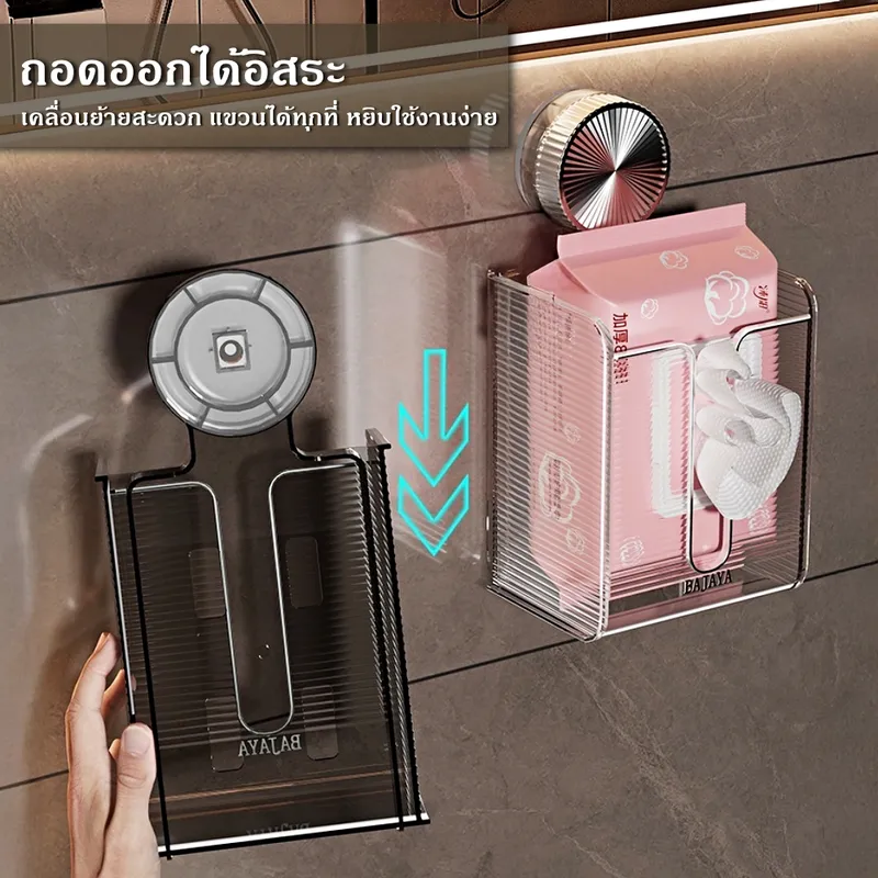 กล่องใส่ทิชชู่ติดผนังสุญญากาศดีไซน์ใส มองเห็นปริมาณกระดาษที่เหลือได้ชัด วางซองได้พอดีและดึงใช้ได้ลื่นมือ ระบบยึดผนังเป็นแผ่นดูดสุญญากาศ พร้อมปุ่มหมุนล็อก ช่วยแนบแน่นกับพื้นผิวเรียบ ไม่ต้องเจาะ ไม่ต้องรอ 48 ชม. เหมือนกาวทั่วไป จะถอดล้าง/ย้ายตำแหน่งเมื่อไรก็ทำได้ทันที และไม่ทำรอยผนัง เหมาะกับบ้าน คอนโด ออฟฟิศ หรือร้านคาเฟ่
