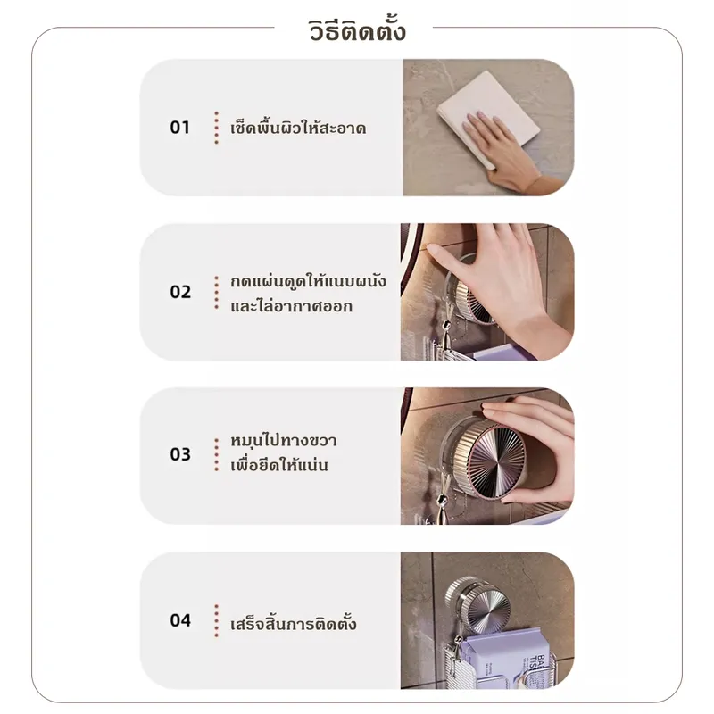 • การติดตั้ง: กดแผ่นดูดไล่อากาศ + หมุนปุ่มเพื่อ “ล็อกสุญญากาศ”