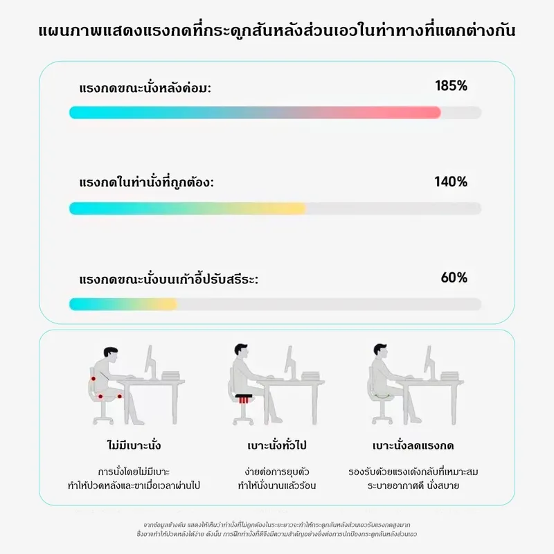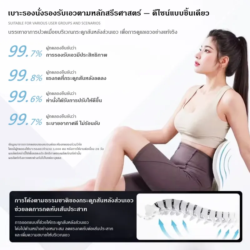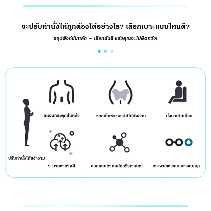 ● เหมาะสำหรับ: พนักงานออฟฟิศที่ต้องนั่งทำงานนาน / ผู้ขับรถระยะไกล / นักเรียน / นักศึกษา / คุณแม่ตั้งครรภ์ หรือผู้ที่มีอาการปวดหลัง / ผู้ป่วยพักฟื้น / ผู้สูงอายุ / คนที่อยากปรับบุคลิกให้นั่งหลังตรง