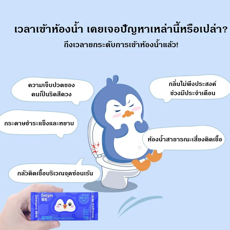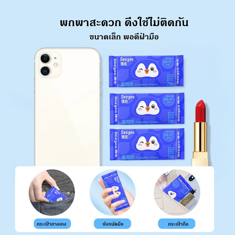 - เป็นทิชชู่เปียกที่สามารถชำระล้างได้ (Flushable Wipes) ฆ่าเชื้อได้ถึง 99.9% บรรจุซองละ 7 แผ่น ดีไซน์ลายนกเพนกวินน่ารัก ขนาดเล็กกว่าลิปสติกและมือถือ เหมาะสำหรับพกพา