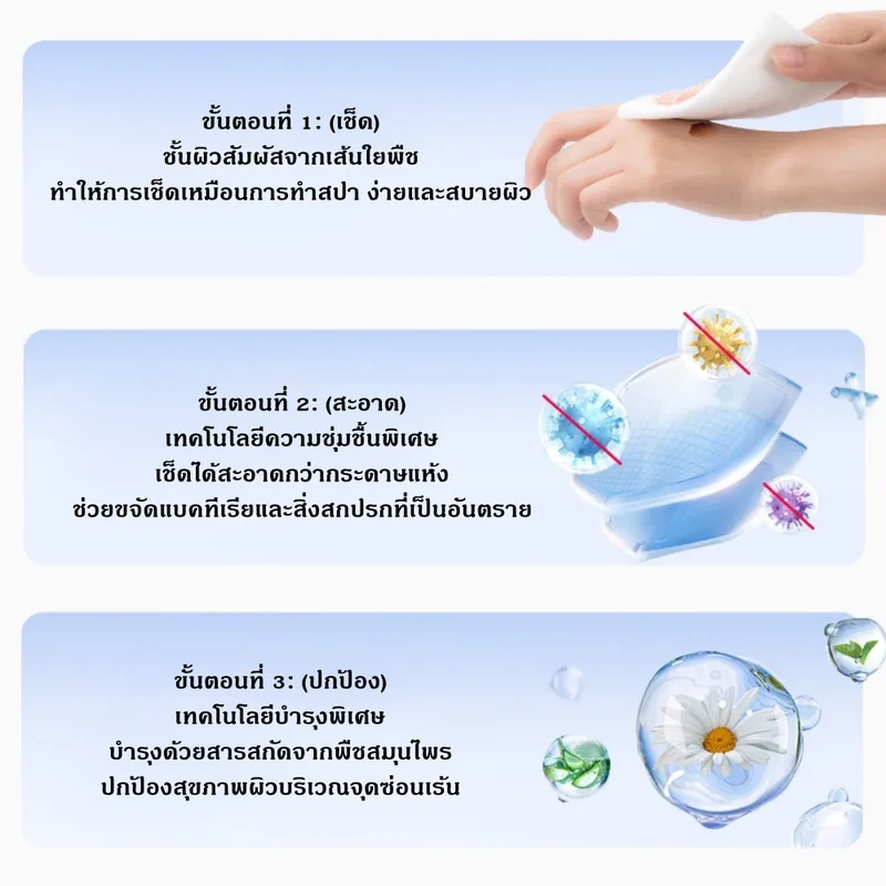 - ขณะเช็ด เช็ดเปียก นุ่มชุ่มชื้น อ่อนโยนต่อผิว