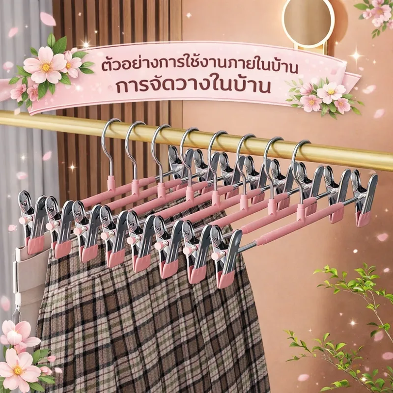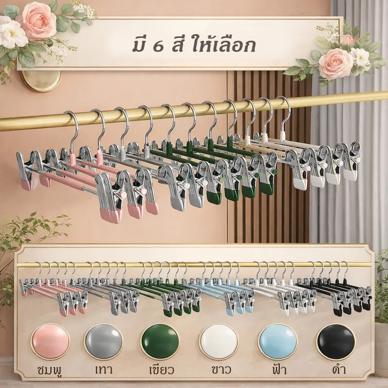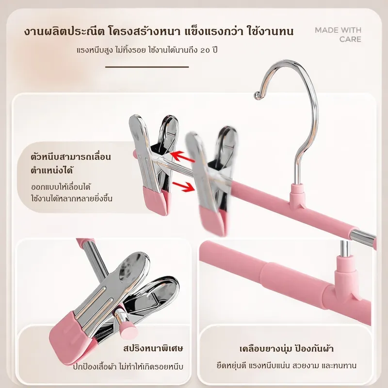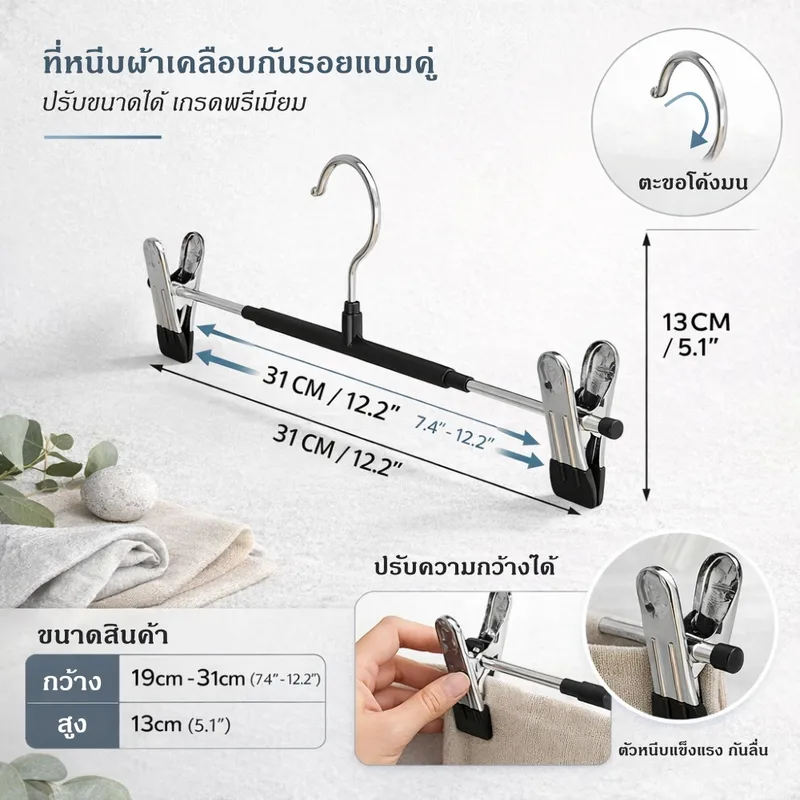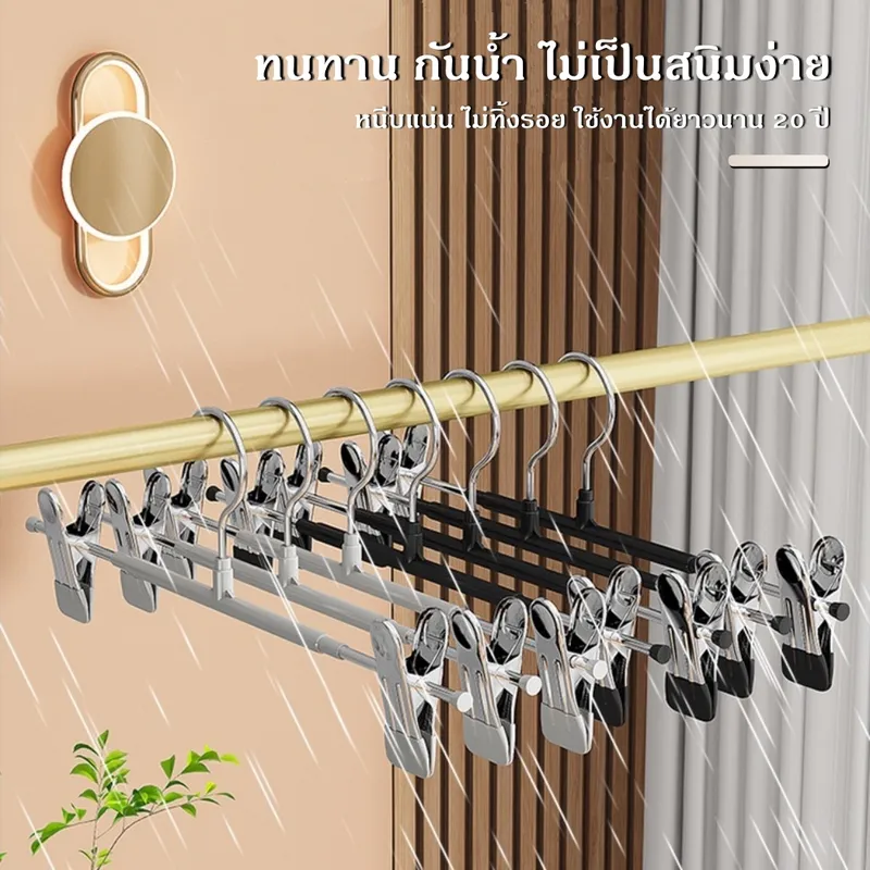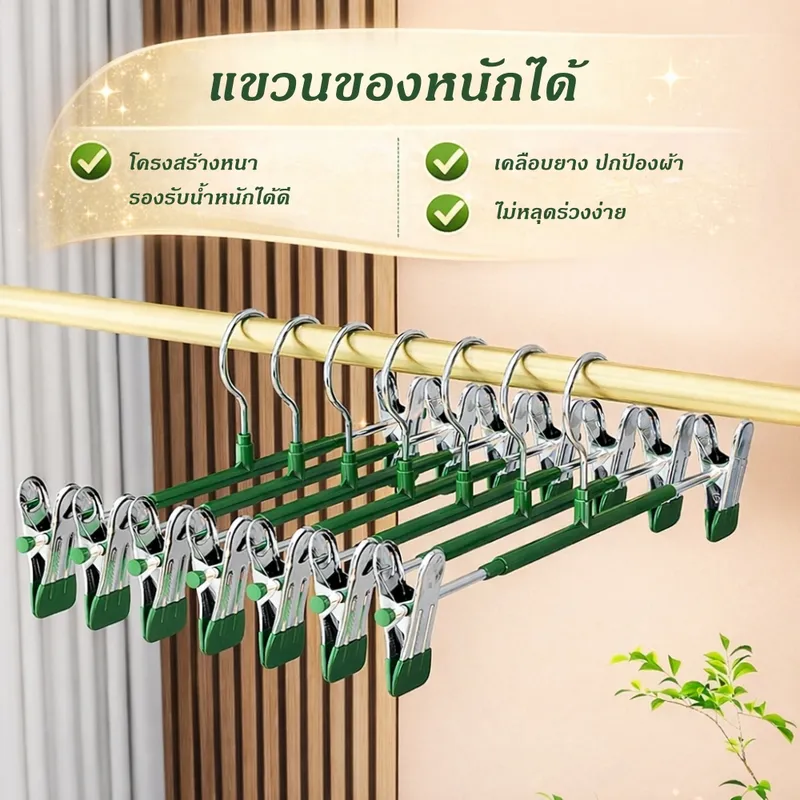 ที่หนีบผ้าเคลือบกันรอยคุณภาพสูง ออกแบบมาเพื่อช่วยให้การจัดเก็บเสื้อผ้าเป็นเรื่องง่าย ตัวคลิปหนีบเคลือบยางนุ่ม ช่วยป้องกันรอยกดบนเนื้อผ้า พร้อมแรงหนีบที่แน่นเป็นพิเศษ ทำให้เสื้อผ้าไม่หลุดแม้โดนลมหรือการเคลื่อนไหวแข็งแรง รองรับน้ำหนักได้ดี ใช้งานได้ทั้งภายในบ้านและกลางแจ้ง ไม่ต้องกังวลเรื่องสนิมหรือความชื้น ตัวหนีบสามารถเลื่อนปรับตำแหน่งได้ เหมาะกับเสื้อผ้าหลากหลายประเภท เช่น กางเกง กระโปรง หรือผ้าชิ้นเล็ก ช่วยเพิ่มพื้นที่ในตู้เสื้อผ้าได้อย่างมีประสิทธิภาพที่หนีบผ้าแบบคู่พร้อมตะขอ จัดเก็บเป็นระเบียบ ประหยัดพื้นที่
