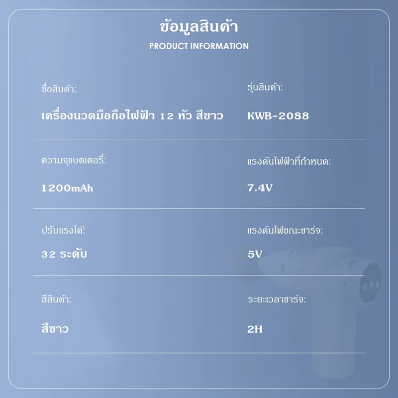 • อุปกรณ์ภายในกล่อง : ปืนนวดกล้ามเนื้อ 1 เครื่อง, หัวนวด 12 แบบ, สายชาร์จ Type-C, คู่มือการใช้งาน