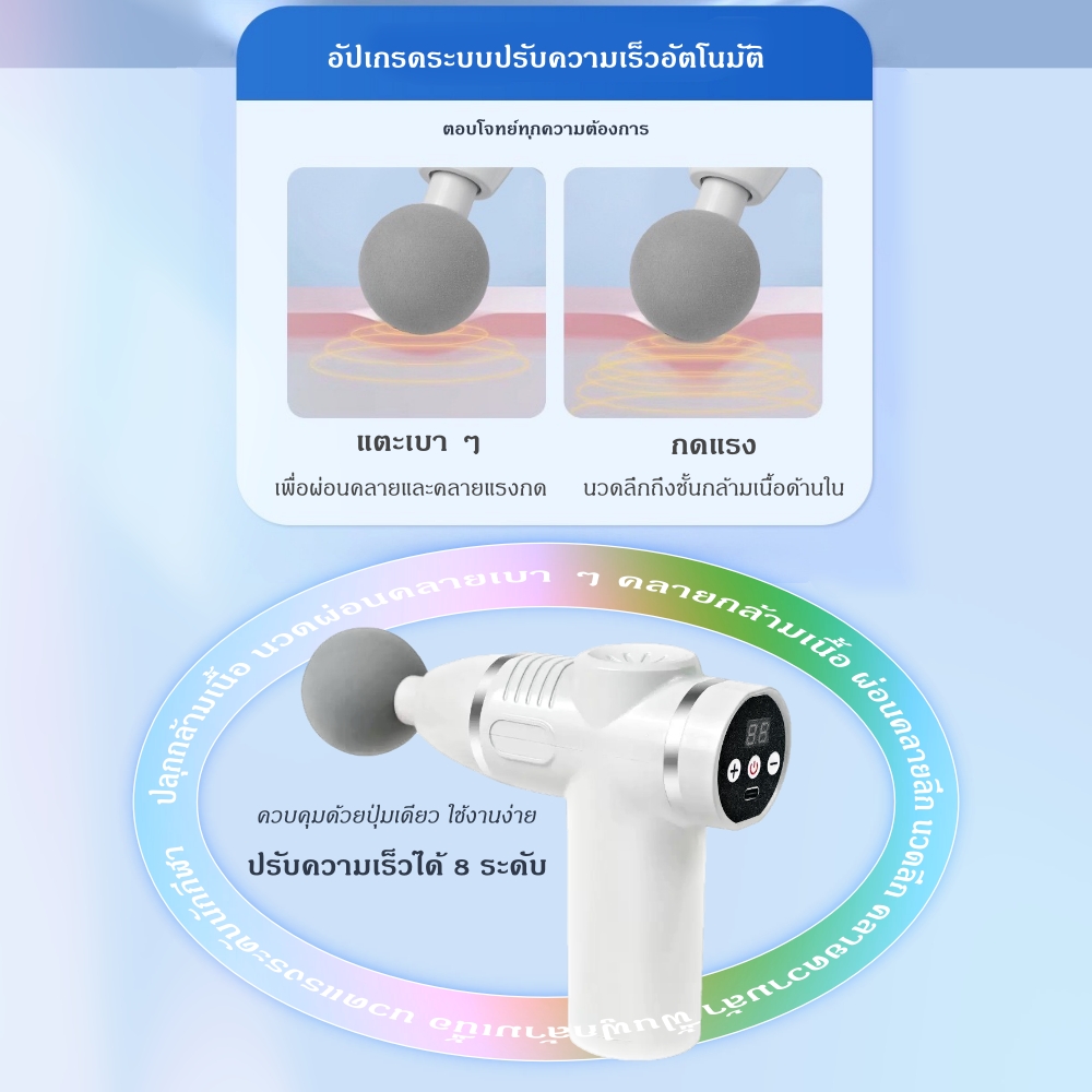 ปืนนวดกล้ามเนื้อขนาดเล็ก ดีไซน์กะทัดรัด น้ำหนักเบา แต่พลังแรงเกินตัว ช่วยคลายกล้ามเนื้อ ลดอาการปวดเมื่อย ฟื้นฟูกล้ามเนื้อได้อย่างมีประสิทธิภาพ เหมาะสำหรับคนทำงาน ออกกำลังกาย นักกีฬา หรือผู้ที่มีอาการเมื่อยล้าเป็นประจำ