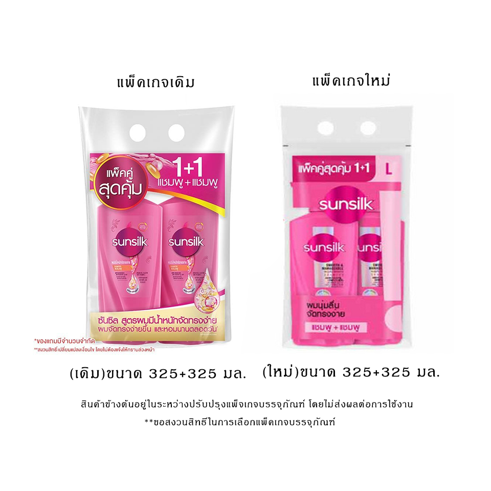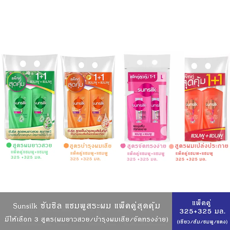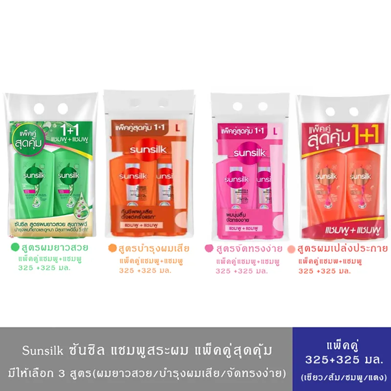 Sunsilk ซันซิล แชมพูยาสระผม+แชมพูยาสระผม(สีชมพู,ส้ม,เขียว) แพ็คคู่ 325+325 มล. 1.ซันซิล แชมพู สูตรผมยาวสวยสุขภาพดี 325 มล. แพ็คคู่ ซันซิล (Sunsilk) ผลิตภัณฑ์แชมพูที่ดูแลเส้นผมของสาวไทยมาอย่างยาวนาน คิดค้นและสร้างสรรค์ผลิตภัณฑ์โดยช่างผมชื่อดังระดับโลก เพื่อตอบโจทย์ปัญหาผมทุกประเภท เพื่อให้ผมสวยพร้อมอยู่เคียงข้างทุกสถานการณ์และทุกโมเม้นต์