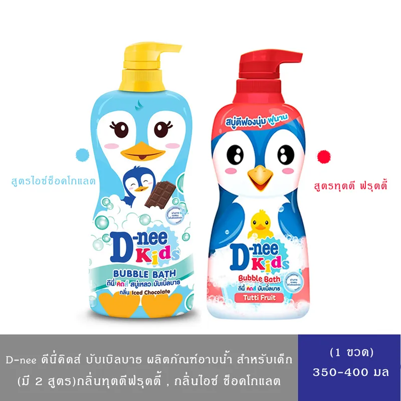 1.D-nee ดีนี่ คิดส์ สบู่เหลว บับเบิ้ลบาธ กลิ่น ทุตตี้ ฟรุตตี(สีแดง) ขวดปั๊ม 350 มล. หอมสดชื่นด้วยกลิ่น ทุตตี้ ฟรุตตี(สีแดง), กลิ่นไอซ์ ช็อกโกแลต(ฟ้า) ที่ให้ความรู้สึกหอมสะอาด สดใส ฟองครีมเนียนนุ่ม ล้างออกง่าย