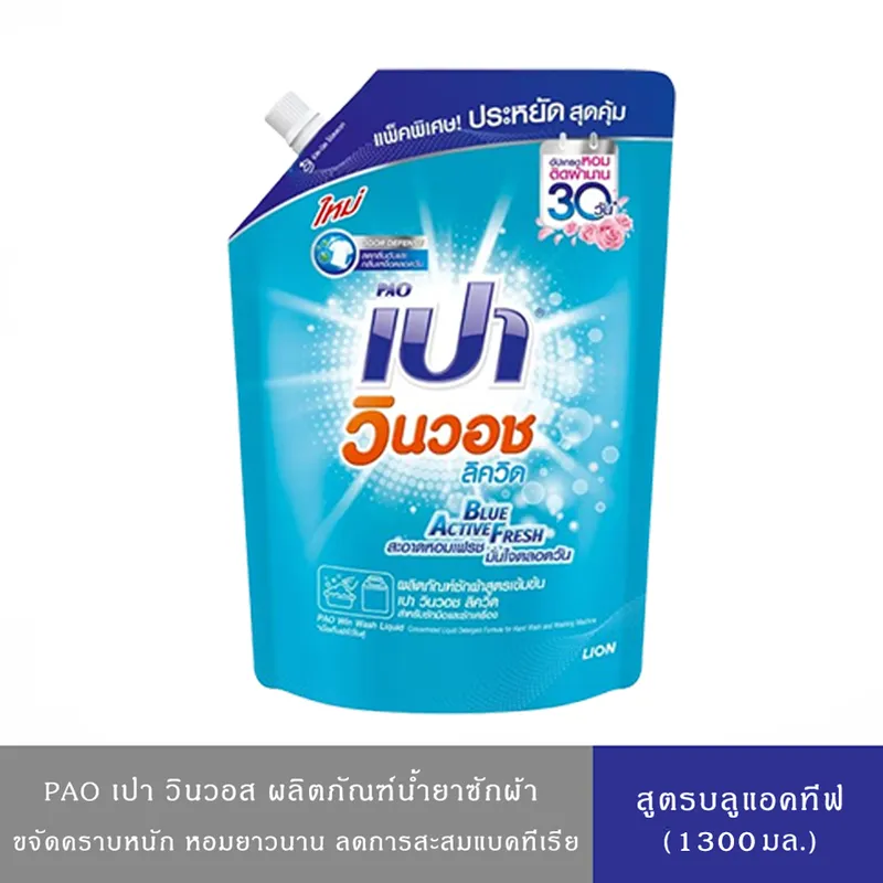 4.น้ำยาซักผ้า เปา วินวอช ลิควิด Blue Active Fresh บลู แอคทีฟ เฟรช ชนิดถุงเติม 1300 มล.Blue Active FreshสูตรOdor Defense ที่มีเทคโนโลยีน้ำหอมสูตรเฉพาะที่เข้ายับยั้งและสลายกลิ่นเหงื่อ