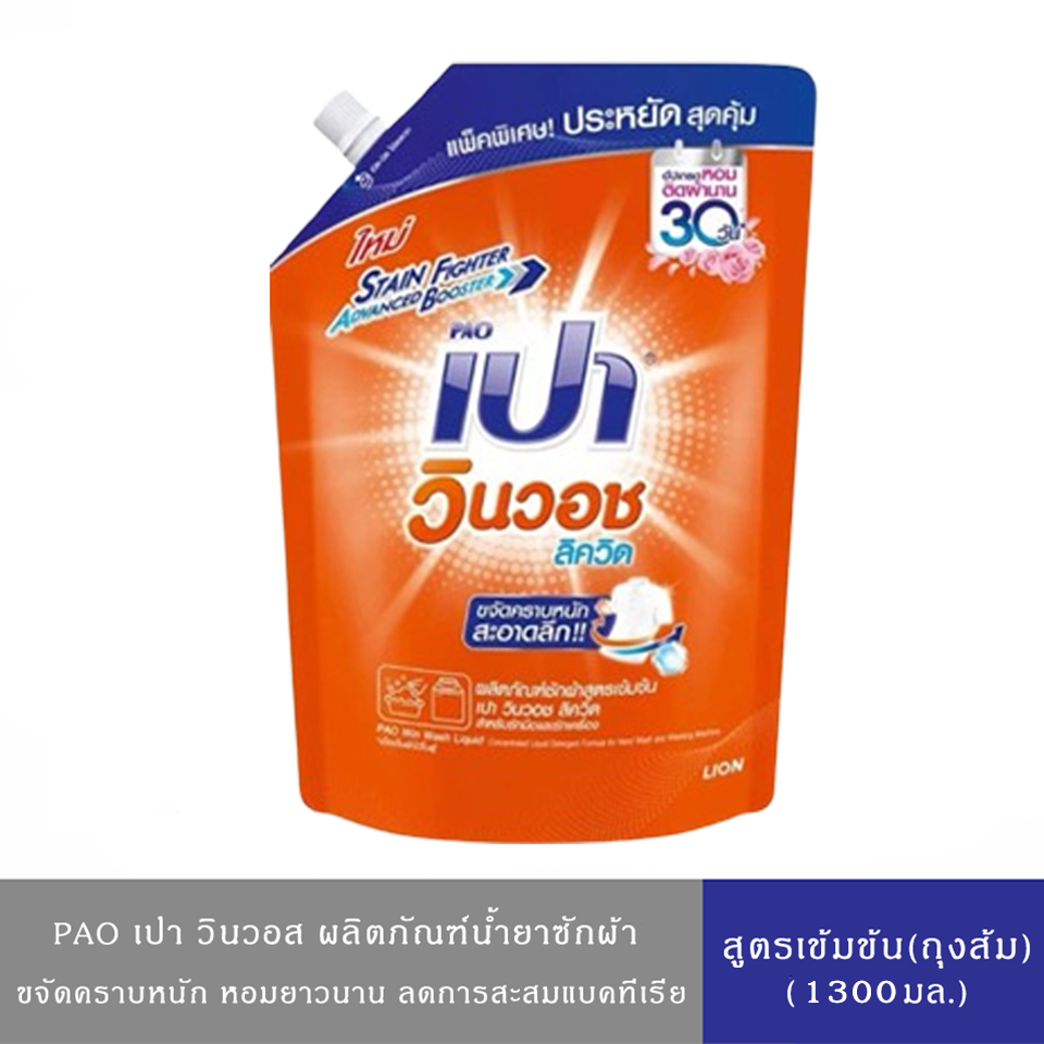2.เปา วินวอช ลิควิด ผลิตภัณฑ์ซักผ้าชนิดน้ำ สูตรเข้มข้น ถุงส้ม 1300 มล. รวม 3 พลังสารทำความสะอาดสูตรเข้มข้น ขจัดคราบหนักซักยาก คราบเหนียวติดหนืด