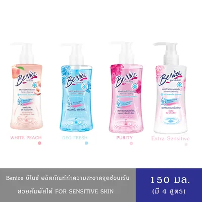 (มีให้เลือก 3 สูตร)BENICE Feminine บีไนซ์ ผลิตภัณฑ์เพื่อจุดซ่อนเร้น สำหรับผู้หญิง สูตรPurity(ชมพูใส),Deo Fresh(ฟ้า),White Peach(พีช) ขนาด 150มล.