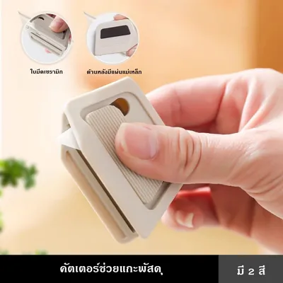 คัตเตอร์ช่วยแกะพัสดุ มี 2 สี แข็งแรงทนทาน ใบมีดเซรามิก ด้านหลังมีแผ่นแม่เหล็ก ใบมีดจะดีดกลับอัตโนมัติ ใบมีดยาว 7 มม. ตัดได้คมและเรียบ กล่อง