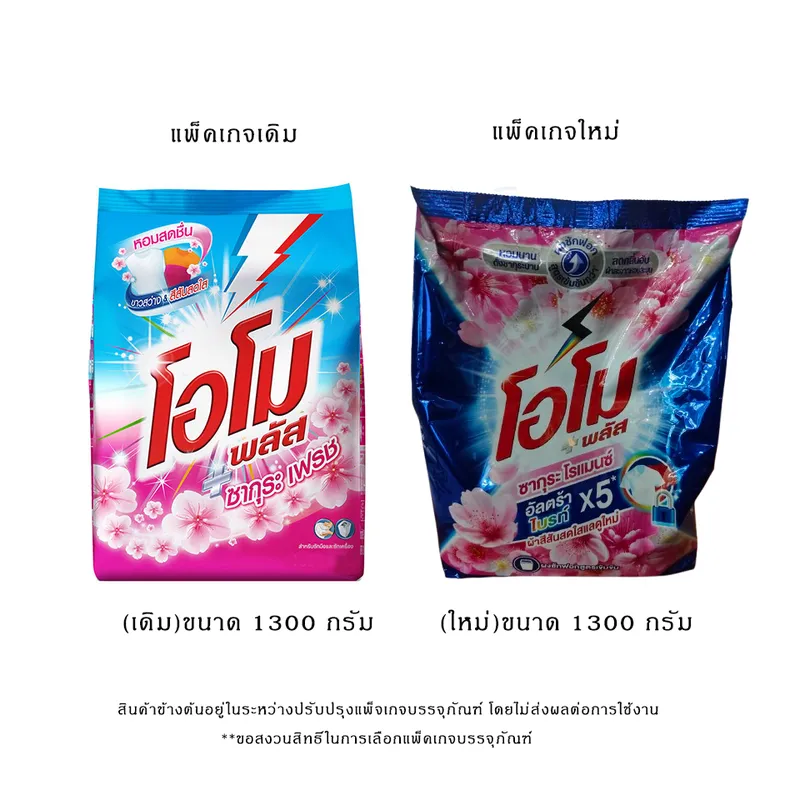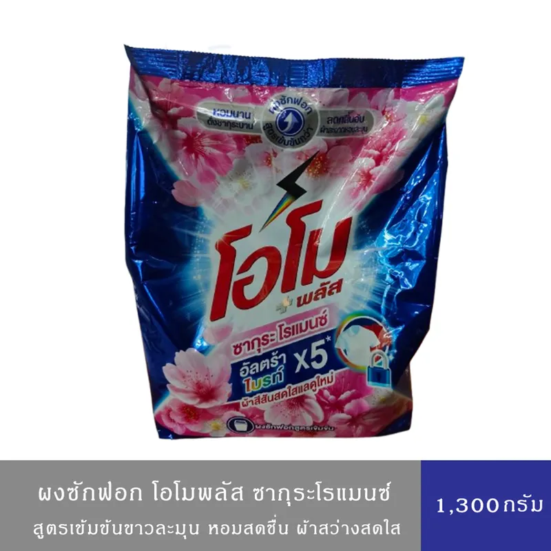 “Omo Plus โอโมพลัส ผงซักฟอก กลิ่นซากุระเฟรช สูตรเข้มข้น ผงซักฟอก 1300 ก. โอโม พลัส ซากุระ บลอสซั่ม ให้กลิ่นหอมสดชื่นโดดเด่นจากดอกไม้นานาชนิด และให้ความสว่างสดใส ด้วยพลังเทคโนโลยีไบร์ทล็อค ทำความสะอาดซอกซอนลึกถึงใยผ้า และช่วยล็อคสิ่งสกปรกจากเสื้อไว้ในน้ำ หมดกังวลเรื่องความหมอง คืนความขาวสะอาด สดใส มั่นใจทั้งผ้าขาว ผ้าสี และมอบความหอมสดชื่น เหมือนมีดอกไม้รอบกายคุณรายละเอียดสินค้า