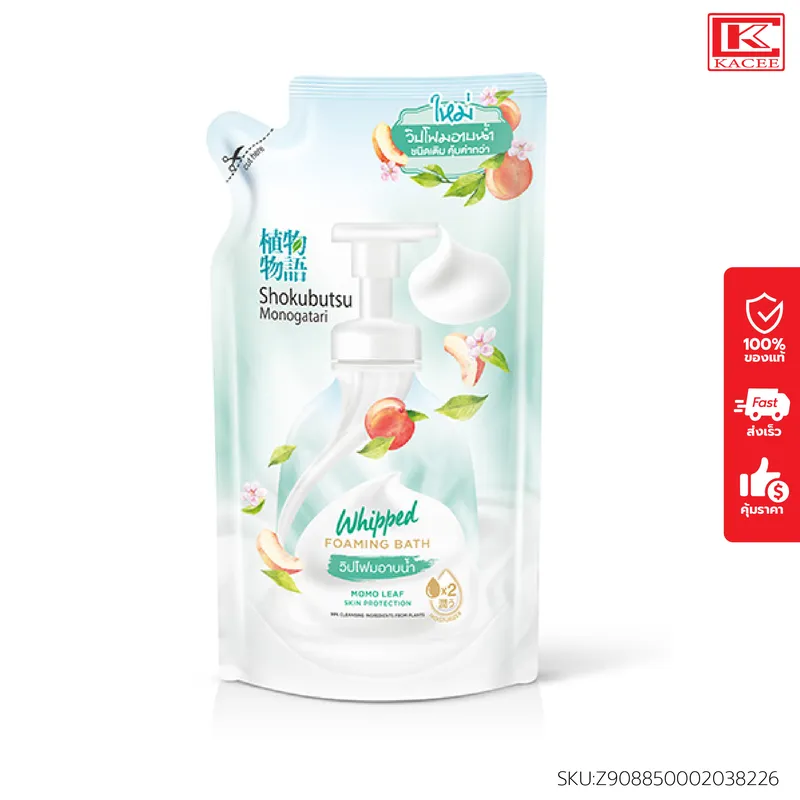SHOKUBUTSU โชกุบุสซึ โมโนกาตาริ วิปโฟมอาบน้ำ ผิวเนียนนุ่ม สะอาดมั่นใจ สูตรโมโมะลีฟ Momo Leaf (เขียว) ถุงเติม 450 ml.
