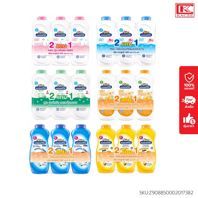 “KODOMO แป้งเด็ก โคโดโม สูตรสวีทตี้คูล Sweetie Cool 350 กรัม (สีน้ำเงิน) แพ็คคู่2+1 ขวด แป้งเด็กโคโดโม สูตรสวีทตี้คูล มีส่วนผสมของเมนทอล ให้ความเย็นสดชื่นอย่างอ่อนโยน และมีส่วนผสมของอโลเวรา (ว่านหางจระเข้) ช่วยให้ผิวนุ่มชุ่มชื่น และช่วยลดอาการคันบนผิวหนังพร้อมผ่านการทดสอบทาง การแพทย์ ว่าอ่อนโยน ไม่ระคายเคือง จากสถาบัน Skinnova Lab เนื้อแป้งผ่านการ Sterilization อีกขั้นของความปลอดภัย มั่นใจ -ให้เด็กคลายร้อน สบายตัว ทำกิจกรรมได้เต็มที่ทั้งวันและปลอดภัยสำหรับทุกคนในครอบครัว ด้วยแป้งที่เข้าใจพัฒนาการของเด็กอย่างลึกซึ้ง เลขจดแจ้ง 20-1-6300023977”