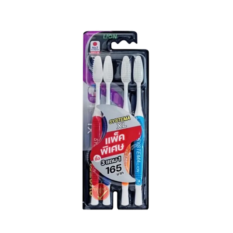 Systema แปรงสีฟัน ซิสเท็มมา ขนแปรง รุ่นนุ่มมาตรฐาน XL แพ็ค 3+1ชิ้น แปรงสีฟันซิสเท็มมา รุ่นหัวแปรงขนาดใหญ่ ขนแปรงนุ่มมาตรฐาน Soft & Slim ผลิตจากวัสดุชนิดพิเศษ PBT (Polybutylene Terephthalate) ซึ่งมีความยืดหยุ่น ทนทาน และคืนรูปได้ดีกว่าขนแปรงไนลอนทั่วไป จึงให้ความนุ่มแบบมีพลัง ไม่ทำความระคายเคืองต่อเหงือก คุณจะรู้สึกได้ถึงความแตกต่างจากขนแปรงทั่วไป เพียงครั้งแรกที่เริ่มใช้แปรงสีฟันซิสเท็มมา นอกจากนี้ มีขนแปรงปลายเรียวแหลม คอแปรงเรียวยาว ทำให้สามารถซอกซอนเข้าถึงทุกพื้นที่ในช่องปาก สะอาดลึกถึงร่องเหงือกขนแปรงนุ่มมาตรฐาน Soft & Slim ผลิตจากวัสดุชนิดพิเศษ PBT ซึ่งมีความยืดหยุ่น ทนทาน และคืนรูปได้ดีกว่าขนแปรงไนลอนทั่วไป จึงให้ความนุ่มแบบมีพลัง ไม่ทำความระคายเคืองต่อเหงือก