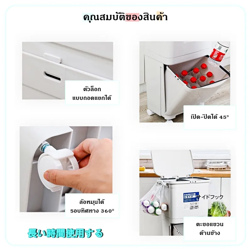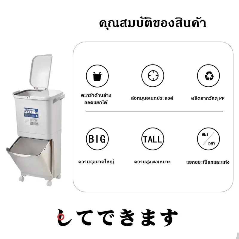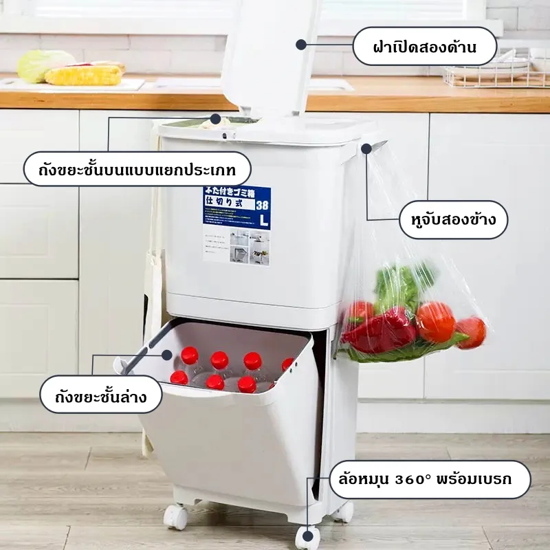 • ดีไซน์ 2 ชั้น – ชั้นบนสำหรับขยะทั่วไป/ขยะรีไซเคิล, ชั้นล่างเป็นลิ้นชักดึงออกได้ เหมาะสำหรับใส่ขวด น้ำดื่ม หรือขยะชิ้นใหญ่