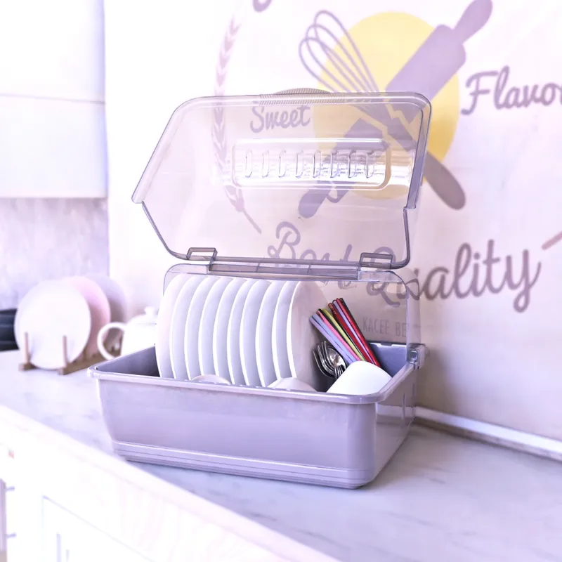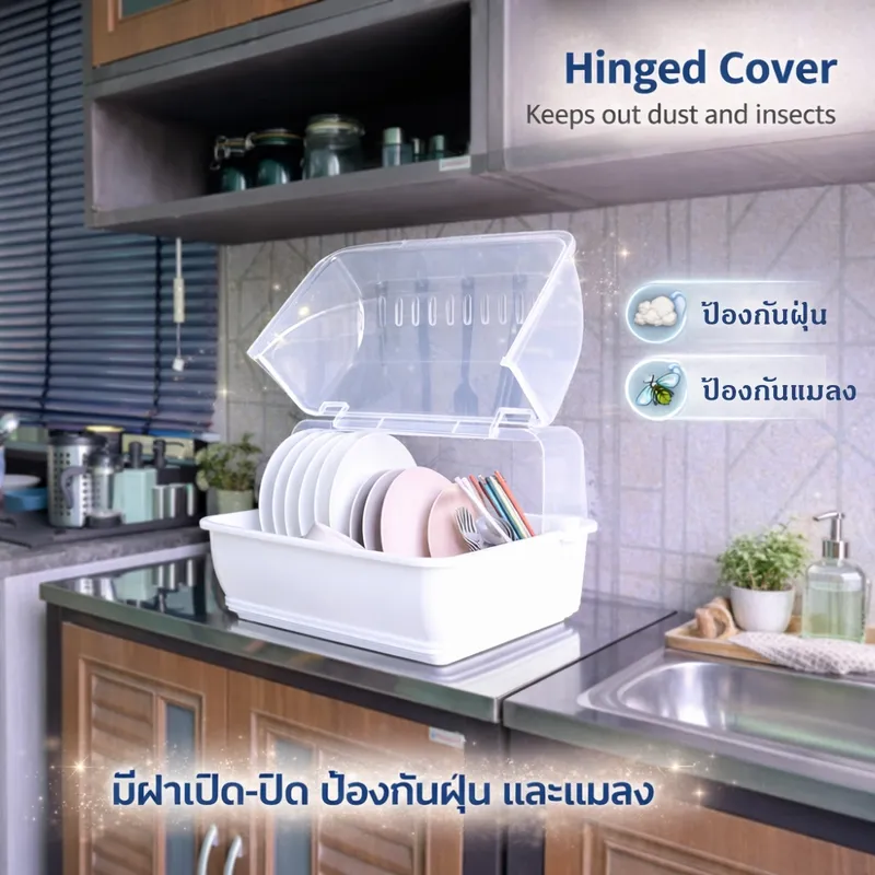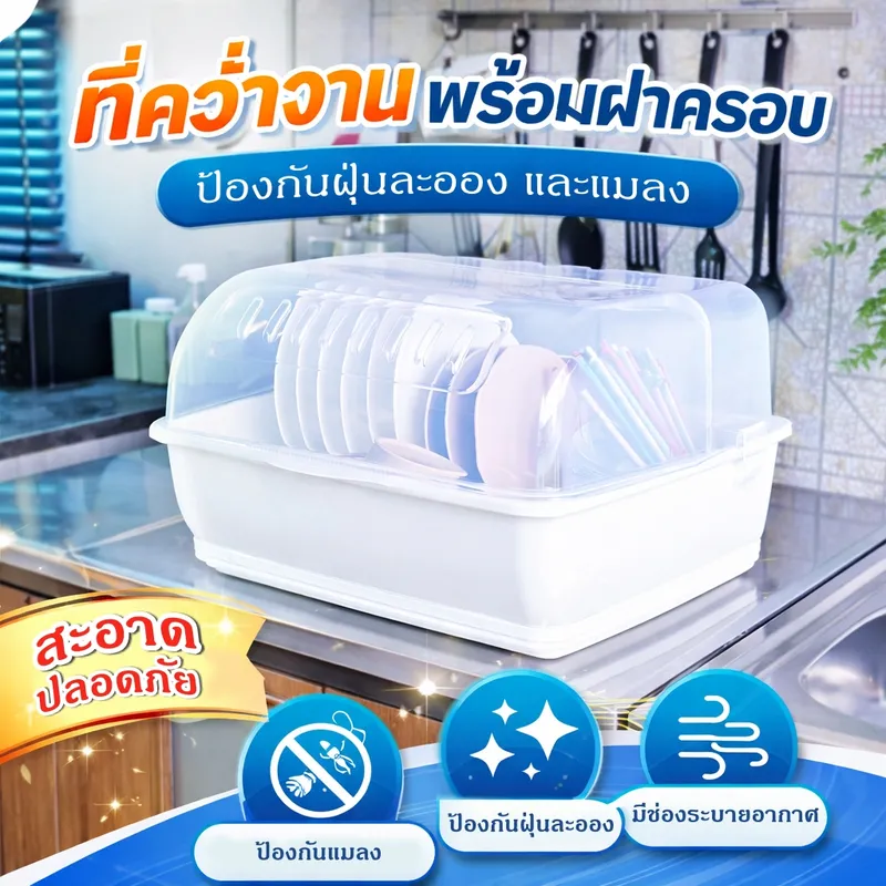 ที่คว่ำจานพร้อมฝาครอบ ตัวช่วยจัดระเบียบครัวให้ภาชนะสะอาด ปลอดภัยจากฝุ่นละอองและแมลง พร้อมดีไซน์เรียบสวยเหมาะกับทุกสไตล์ครัว ออกแบบมาเพื่อการใช้งานจริงฝาครอบใสช่วยป้องกันสิ่งสกปรกภายนอก ขณะเดียวกันยังมี ช่องระบายอากาศ ช่วยให้น้ำแห้งเร็วลดกลิ่นอับ และไม่สะสมความชื้น จัดเก็บจาน ชาม แก้ว และช้อนส้อมได้เป็นระเบียบ